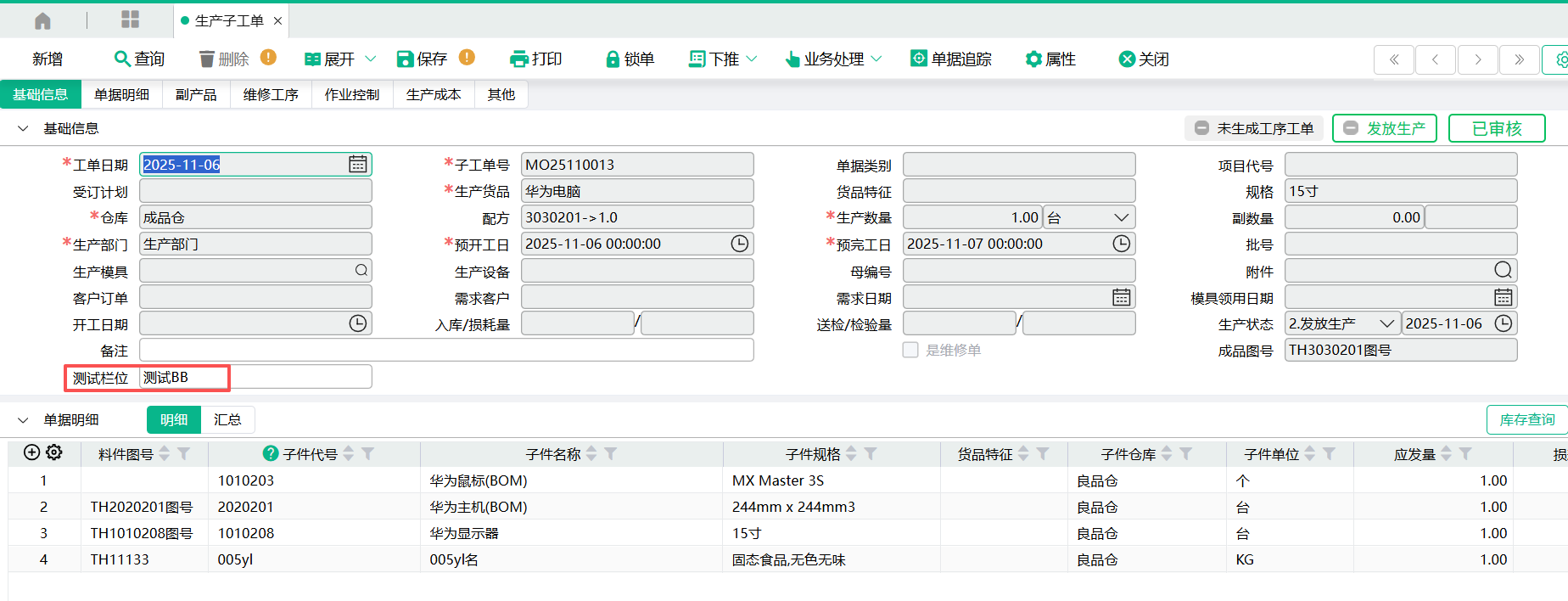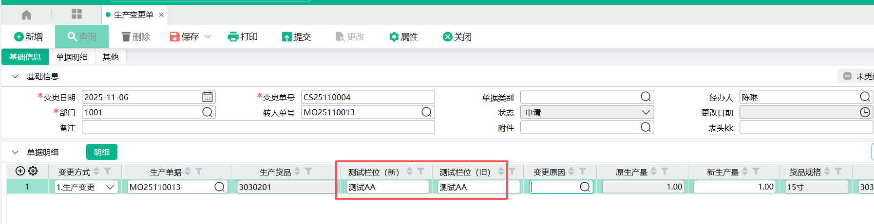 6、生产变更单变更生产子工单表头自定义栏位示例