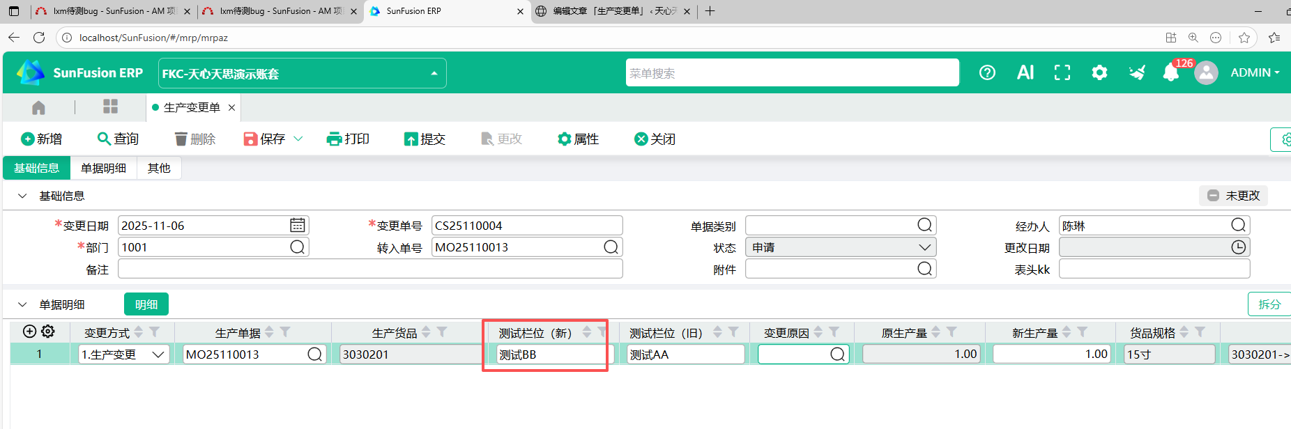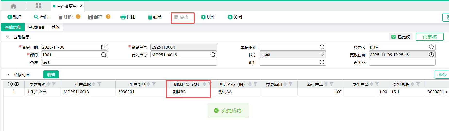 (4)修改生产变更单自定义字段SS1的值,点击保存,执行更改