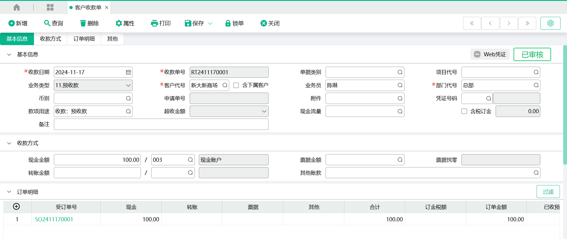 (1)、进入【客户收款单】页面,表头【业务类型】选择【11.预收款】、【12.保证金】、【13.定金】,输入表头【客户代号】、【部门代号】,在对应【收款方式】现金金额、转账金额、票据金额、其他账款,输入收款金额、收款账户、票据号码、其他账款代号等栏位值,点【保存】;如收款是有来源受订单时,在订单明细表身选择来源受订单号,在对应收款方式栏位输入收款金额,点【保存】。