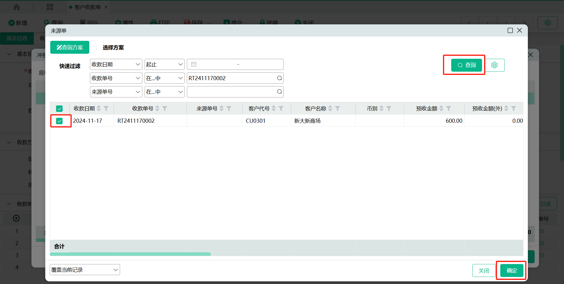 (2)、在【收款方式】区域,点入【冲预收款】窗口,选取预收款单号记录,确认【本次冲账金额】无误后,点【确定】,带入【冲预收款】栏位值 ;