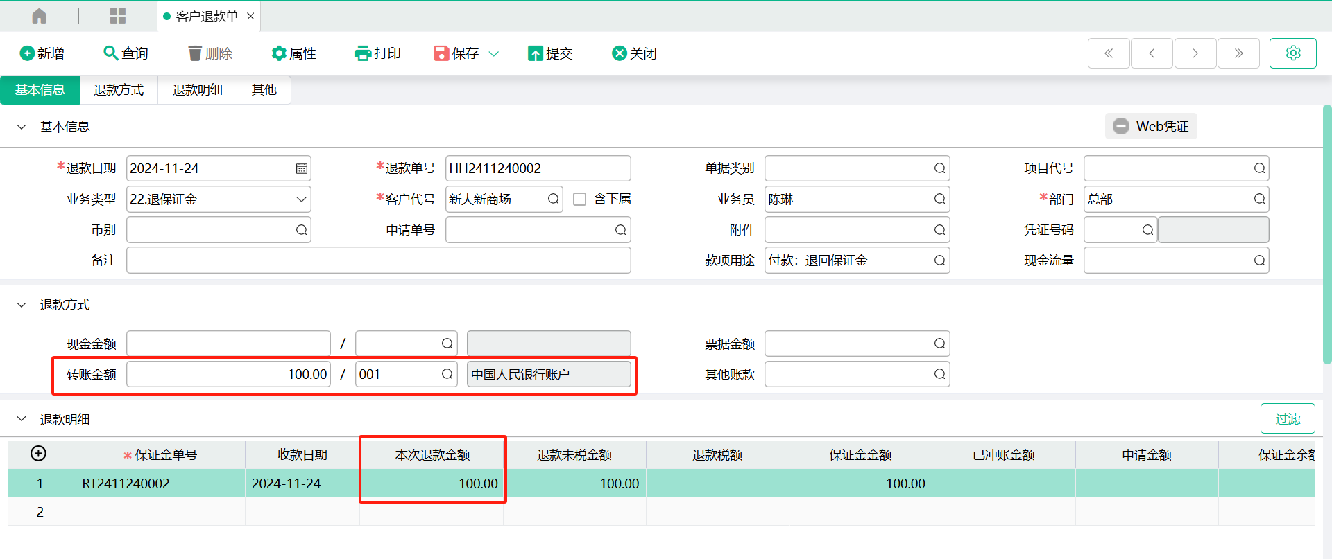 (2)、 在【退款明细】表身确认保证金单号的【本次退款金额】,可手工修改【本次退款金额】,在【退款方式】区域,输入转账金额和银行账户 ;