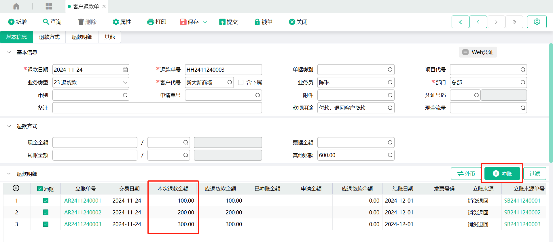 (3)、点【冲账】按钮,系统会自动把退款金额从上到下分摊到表身有勾选【冲账】选项的立账单号记录的【本次退款金额】栏位值,或手工直接输入表身立账单号记录的【本次退款金额】栏位值;