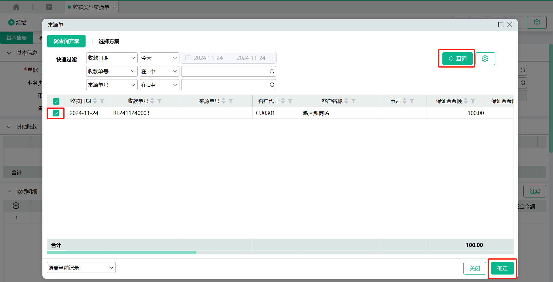 1、新增【收款类型转换单】-保证金转预收款