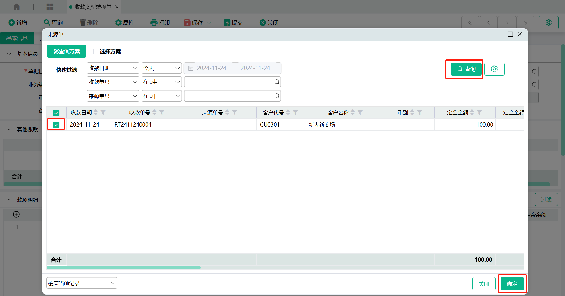 2、新增【收款类型转换单】-定金转预收款