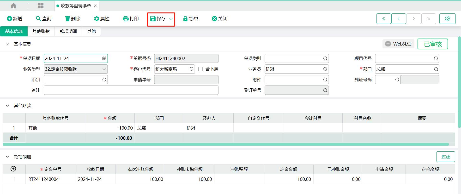 4、新增【收款类型转换单】-预收款转定金