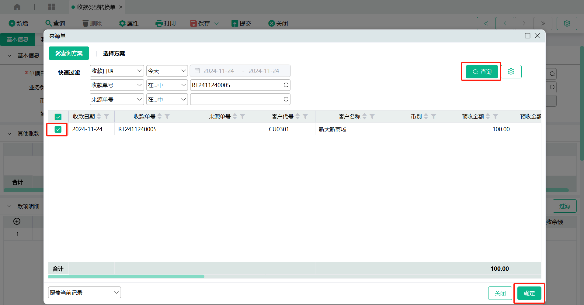 菜单位置:资金管理——应收账款管理 ——收款/核销——收款类型转换单