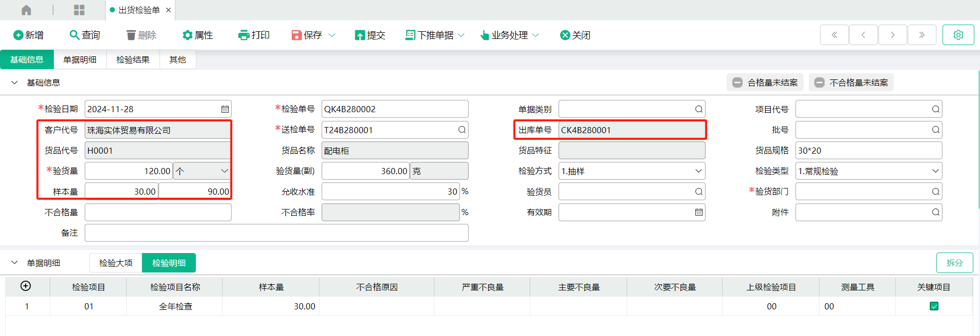 - 出货送检单相关信息会自动带入到出货检验单表头相应栏位;检验方式及样本量也会根据基础资料设置的“货品检验标准”和“样本量”自动带出;
