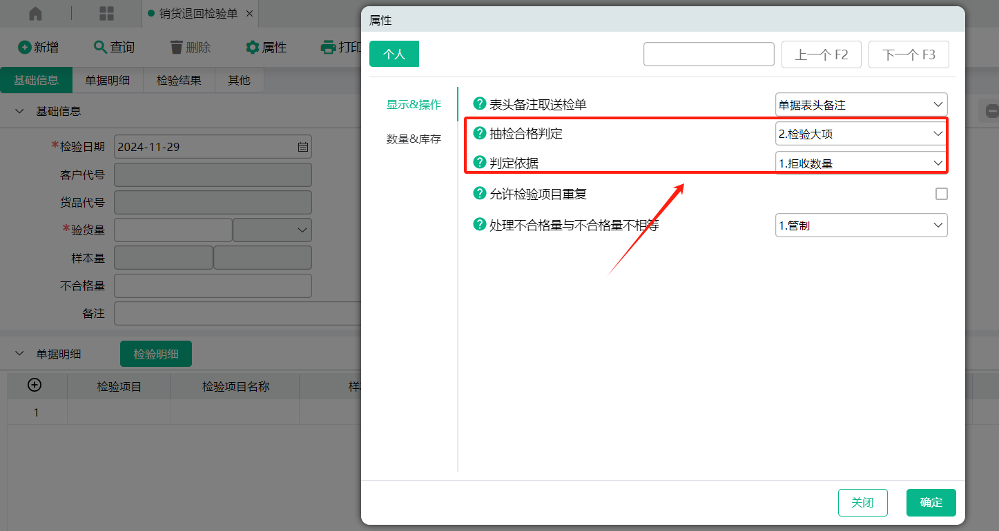 - 检验部门除了可以通过检验明细的方式检验,还可以通过检验大项的方式检验,此处先介绍通过检验大项中不合格量和拒收数量的比较,来判定货品合格与否。首先需要设置单据属性,如下: